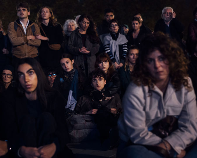 Several thousand Parisians gathered in the Place de la République in Paris to watch the live broadcast of the ceremony commemorating the tenth anniversary of the November 13, 2015 attacks. November 13, 2025. © Lucien Lung / Riva-Press