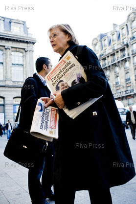 Légende : Paris, le 13 octobre 2009 - Marie-Georges Buffet, premier secretaire du Parti Communiste (PCF) distribue la nouvelle formule de l'Humanite devant la gare du Nord.