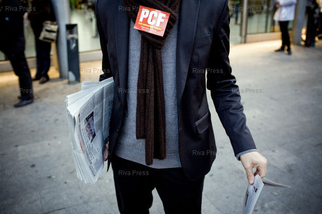 Légende : Paris, le 13 octobre 2009 - Un militant communiste distribue la nouvelle formule de l'Humanite devant la gare du Nord. Marie-Georges Buffet, premier secretaire du Parti Communiste (PCF) a egalement participe a l'operation.