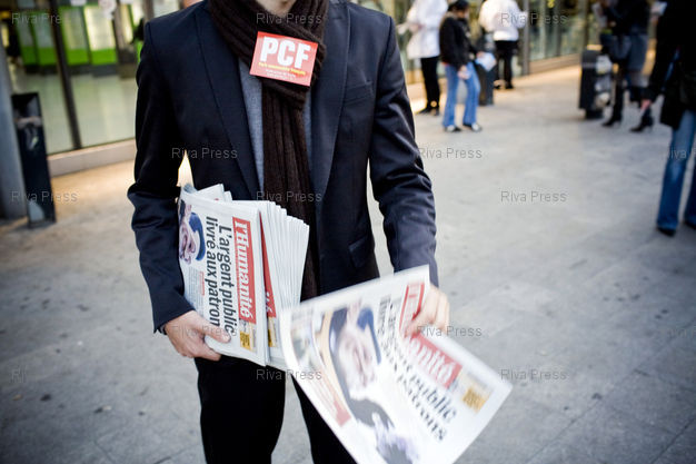 Légende : Paris, le 13 octobre 2009 - Un militant communiste distribue la nouvelle formule de l'Humanite devant la gare du Nord. Marie-Georges Buffet, premier secretaire du Parti Communiste (PCF) a egalement participe a l'operation.