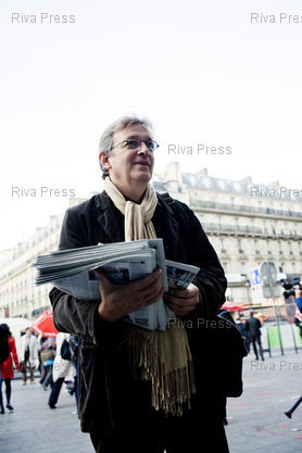 Légende : Paris, le 13 octobre 2009 - Pierre Laurent, membre du PCF et ancien directeur de la redaction de l'Humanite distribue la nouvelle formule du journal devant la gare du Nord.
