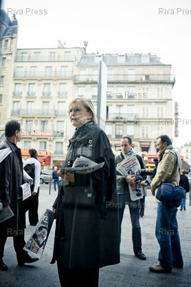 Légende : Paris, le 13 octobre 2009 - Marie-Georges Buffet, premier secretaire du Parti Communiste (PCF) distribue la nouvelle formule de l'Humanite devant la gare du Nord.
