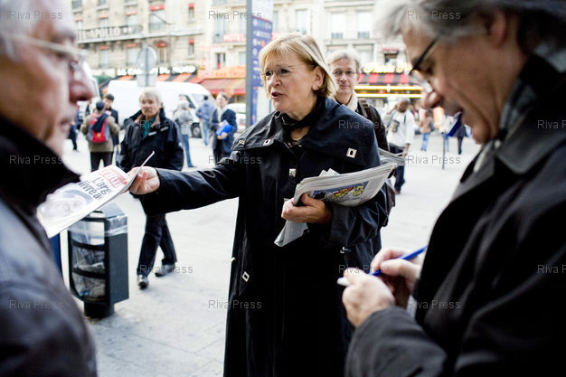 Légende : Paris, le 13 octobre 2009 - Marie-Georges Buffet (C), premier secretaire du Parti Communiste (PCF) distribue la nouvelle formule de l'Humanite devant la gare du Nord, en compagnie de Patrick Le Hyaric (D), directeur du journal.