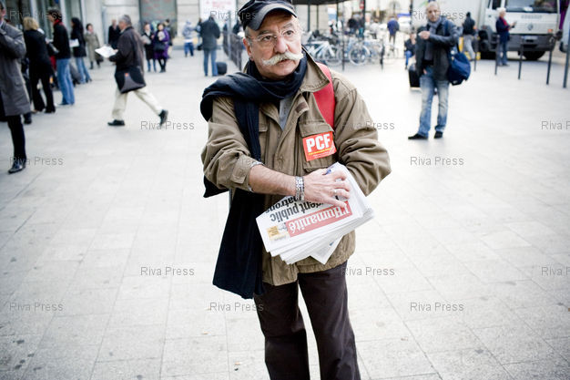 Légende : Paris, le 13 octobre 2009 - Un militant communiste distribue la nouvelle formule de l'Humanite devant la gare du Nord. Marie-Georges Buffet, premier secretaire du Parti Communiste (PCF) a egalement participe a l'operation.