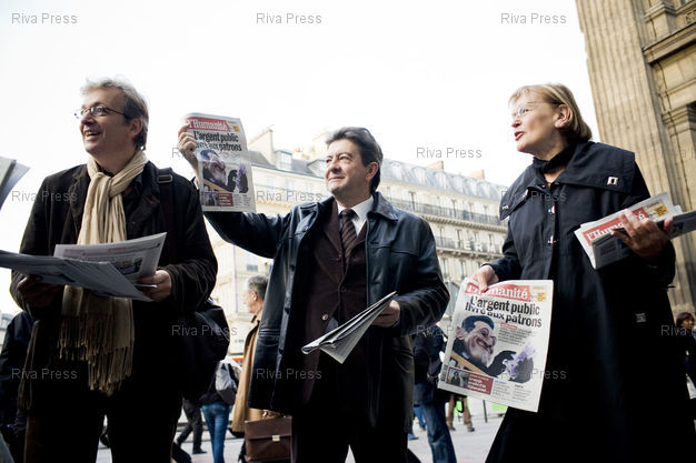 Légende : Paris, le 13 octobre 2009 - Marie-Georges Buffet (D), premier secretaire du Parti Communiste (PCF) distribue la nouvelle formule de l'Humanite devant la gare du Nord, en compagnie de Jean-Luc Melenchon (C), du Parti de Gauche et de Pierre Laurent (G), membre du PCF et ancien directeur de la redaction de l'Humanite.