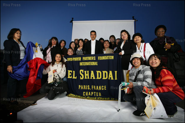 Légende : Des milliers de fideles sont venus en famille pour accueillir le Pape sur l'esplanade ds Invalides. Paris, FRANCE-13/09/2008