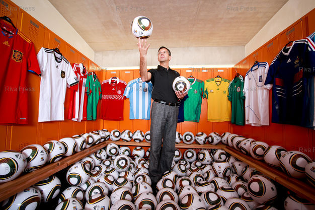 Légende : Herbert Hainer, CEO of Adidas, poses in the locker room of the stadium of the head office of Adidas. Nuremberg, Germany-11/12/2009
