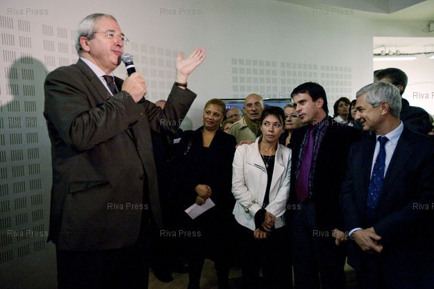 Légende : Paris, le 17 novembre 2009 - Jean-Paul Huchon (G), president socialiste de la region Ile-de-France inaugure rue Falguiere dans le 15eme arrondissement, son local de campagne pour les prochaines elections regionales de mars 2010 ou il sera en lice pour un troisieme mandat. Avec Manuel Valls (2eD, cravate mauve), depute-maire d'Evry et Claude Bartolone (D), depute et president du conseil general de Seine-Saint-Denis.