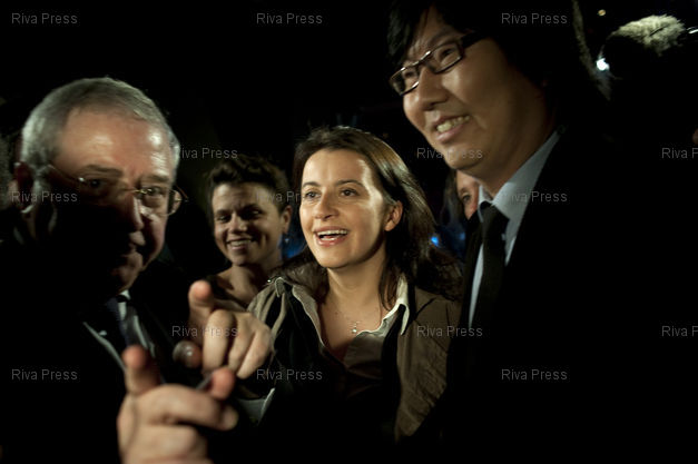 Légende : 21/03/2010 - PARIS, France - Les militants et les candidats de la liste de la gauche et des écologistes pour les élections régionales en Ile de France se retrouvent au bar Le Player (161 rue Montmartre dans le 2ème arrondissement) pour célebrer la victoire au soir du second tour autour de leur tête de liste, le président sortant Jean-Paul Huchon. De G. à D., Jean-Paul Huchon, Cécile Duflot et Jean-Vincent Placé.