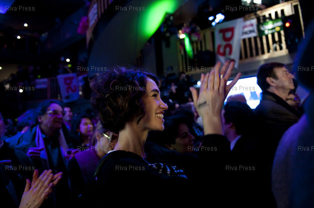 Légende : 21/03/2010 - PARIS, France - Les militants et les candidats de la liste de la gauche et des écologistes pour les élections régionales en Ile de France se retrouvent au bar Le Player (161 rue Montmartre dans le 2ème arrondissement) pour célebrer la victoire au soir du second tour autour de leur tête de liste, le président sortant Jean-Paul Huchon.
