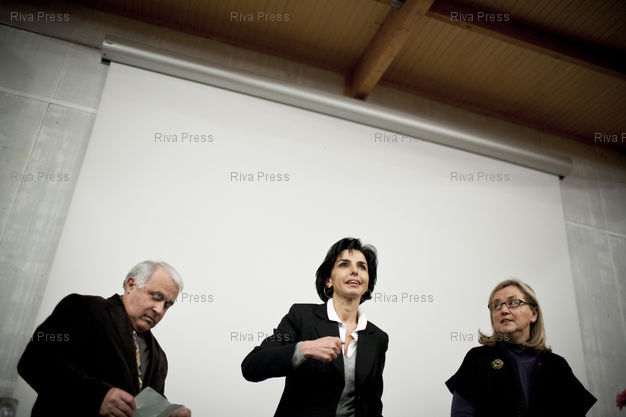 Légende : Paron, le 21 janvier 2010 - Rachida Dati, maire du VIIeme arrondissement de Paris, deputee europeenne et ancienne Garde des Sceaux participe a un debat sur l'identite nationale a Paron, dans l'Yonne.
