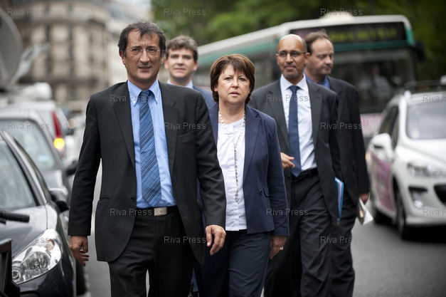 Légende : 08/06/2010 - PARIS, France - Martine Aubry (entourée de François Lamy, Arnaud Montebourg et Harlem Désir) arrive au conseil national du Parti Socialiste consacré au vote du projet de rénovation, incluant le non-cumul des mandats et l'organisation des primaires pour la prochaine élection présidentielle.