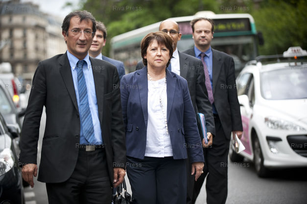 Légende : 08/06/2010 - PARIS, France - Martine Aubry (entourée de François Lamy, Arnaud Montebourg et Harlem Désir) arrive au conseil national du Parti Socialiste consacré au vote du projet de rénovation, incluant le non-cumul des mandats et l'organisation des primaires pour la prochaine élection présidentielle.
