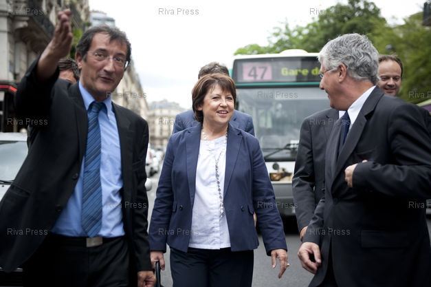 Légende : 08/06/2010 - PARIS, France - Martine Aubry (entourée de François Lamy et de Philippe Martin) arrive au conseil national du Parti Socialiste consacré au vote du projet de rénovation, incluant le non-cumul des mandats et l'organisation des primaires pour la prochaine élection présidentielle.
