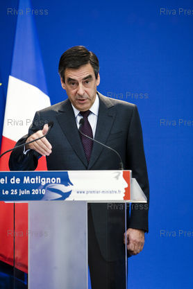 Conference de presse a Matignon de Francois Fillon, premier ministre, au lendemain de la journee de manifestation contre les reformes du gouvernement sur les retraites.