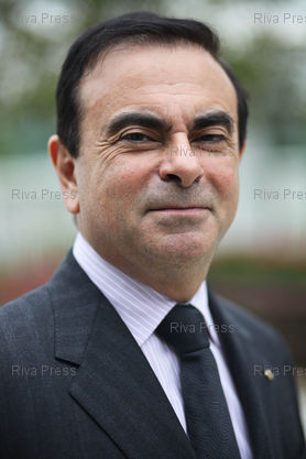 Légende : Carlos Ghosne, PDG de Renault, pose au siege de Renault devant les Z.E, nouveaux modeles 100% electriques de la marque. Boulogne-Billlancourt, FRANCE-14/06/2010