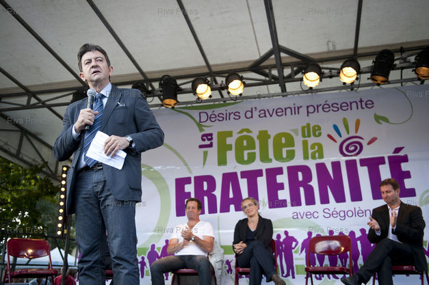 Légende : 18/09/2010 - ARCEUIL, France - La socialiste Ségolène Royal réunit environ 3000 personnes pour sa 3ème fête de la fraternité, organisée au parc du coteau à Arcueil (Val-de-Marne). Plusieurs ténors de la gauche et du parti socialiste (dont Jean-Luc Mélenchon sur la photo) y participent.