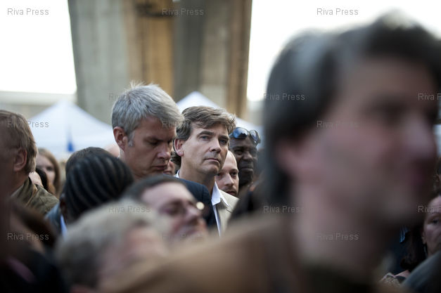 Légende : 18/09/2010 - ARCEUIL, France - La socialiste Ségolène Royal réunit environ 3000 personnes pour sa 3ème fête de la fraternité, organisée au parc du coteau à Arcueil (Val-de-Marne). Plusieurs ténors de la gauche et du parti socialiste (dont Arnaud Montebourg sur la photo) y participent.