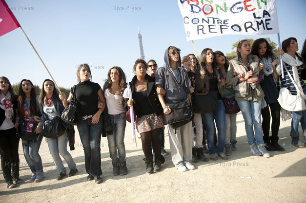Légende : 14/10/2010 - PARIS, France - Plusieurs centaines de lycéens et étudiants manifestent entre l'école militaire et le sénat contre la loi de réforme des retraites.
