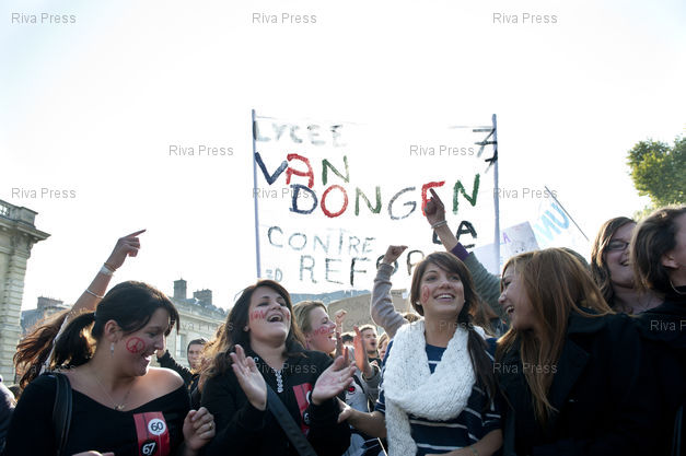 Légende : 14/10/2010 - PARIS, France - Plusieurs centaines de lycéens et étudiants manifestent entre l'école militaire et le sénat contre la loi de réforme des retraites.