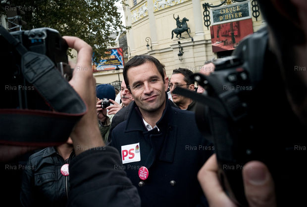 Légende : 16/10/2010 - Paris, FRANCE - Manifestation a Paris contre le projet de reforme des retraites du gouvernement. Benoit HAMON dans le clan socialiste. PHOTO : RIJASOLO/RIVA PRESS