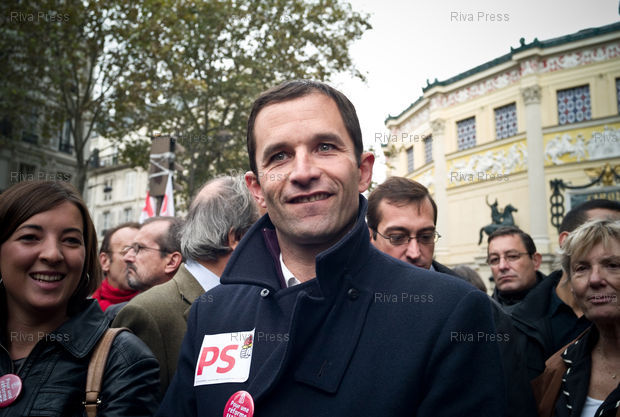 Légende : 16/10/2010 - Paris, FRANCE - Manifestation a Paris contre le projet de reforme des retraites du gouvernement. Benoit HAMON dans le clan socialiste. PHOTO : RIJASOLO/RIVA PRESS