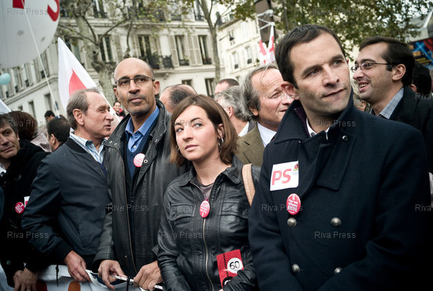 Légende : 16/10/2010 - Paris, FRANCE - Manifestation a Paris contre le projet de reforme des retraites du gouvernement. Bertrand DELANOE, Harlem DESIR et Benoit HAMON dans le clan socialiste. PHOTO : RIJASOLO/RIVA PRESS
