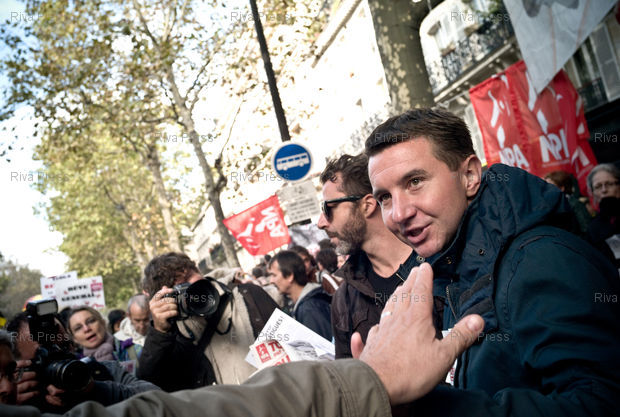 Légende : 16/10/2010 - Paris, FRANCE - Manifestation a Paris contre le projet de reforme des retraites du gouvernement. Olivier BESANCENOT. PHOTO : RIJASOLO/RIVA PRESS