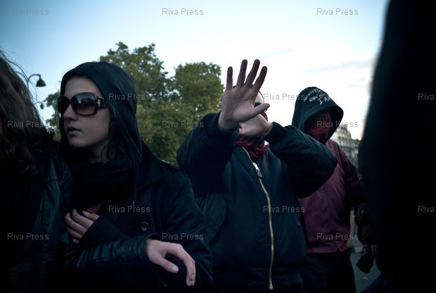Légende : 16/10/2010 - Paris, FRANCE - Manifestation a Paris contre le projet de reforme des retraites du gouvernement. PHOTO : RIJASOLO/RIVA PRESS