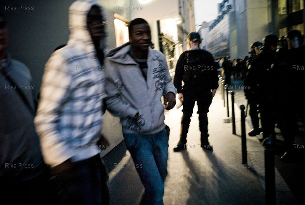 Légende : 16/10/2010 - Paris, FRANCE - Manifestation a Paris contre le projet de reforme des retraites du gouvernement. Altercations avec les forces de l'ordre dans le quartier Bastille apres la manifestation. PHOTO : RIJASOLO/RIVA PRESS