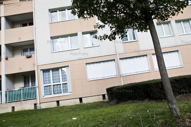 Légende : La Verriere, le 24 octobre 2010 - Les fenetres de l'appartement (2e etage, au centre) d'ou onze personnes se seraient "defenestrees" pour des raisons encore non determinees le 23 octobre au petit matin, entrainant la mort d'un bebe de quatre mois.