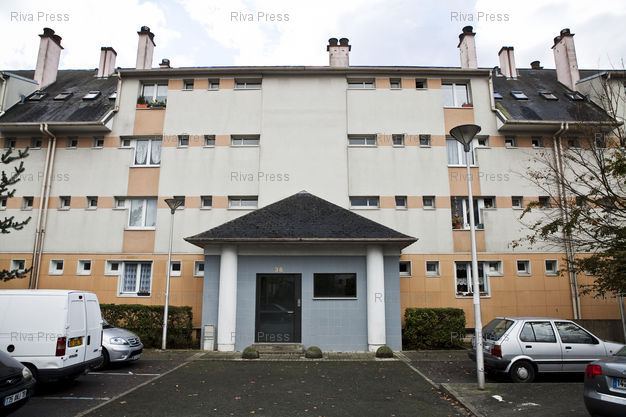 Légende : La Verriere, le 24 octobre 2010 - L'entree de l'immeuble ou se trouve l'appartement d'ou onze personnes se seraient "defenestrees" pour des raisons encore non determinees le 23 octobre au petit matin, entrainant la mort d'un bebe de quatre mois.