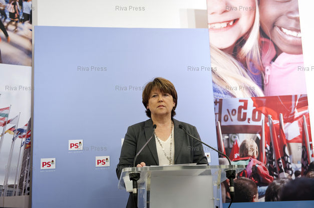 Légende : 16/11/2010 - PARIS, France - La première secrétaire du Parti Socialiste Martine Aubry réagit en conférence de presse à l'intervention télévisée du président de la république Nicolas Sarkozy, deux jours après un remaniement ministériel.