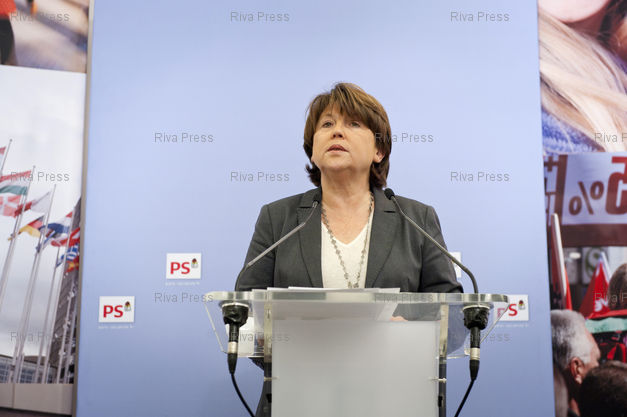 Légende : 16/11/2010 - PARIS, France - La première secrétaire du Parti Socialiste Martine Aubry réagit en conférence de presse à l'intervention télévisée du président de la république Nicolas Sarkozy, deux jours après un remaniement ministériel.