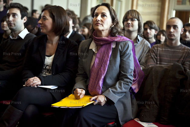 FRANCE - Paris, November 27, 2010 - Former Socialist candidate for presidential elections Segolene Royal attends the Young Socialists meeting on health issues. With Laurianne Deniaud (L), French Young Socialists president. PHOTO: Vincent NGUYEN / Riva Press
