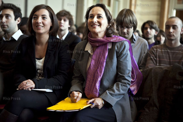 FRANCE - Paris, November 27, 2010 - Former Socialist candidate for presidential elections Segolene Royal attends the Young Socialists meeting on health issues. With Laurianne Deniaud (L), French Young Socialists president. PHOTO: Vincent NGUYEN / Riva Press
