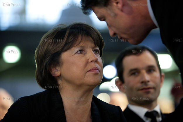 Légende : 11/12/2010 - PARIS, France - Martine Aubry et Vincent Peillon participent à la convention nationale du Parti Socialiste pour l'égalité réelle (intitulée "Egalité = réelle") à la halle Freyssinet dans le 13ème arrondissement.