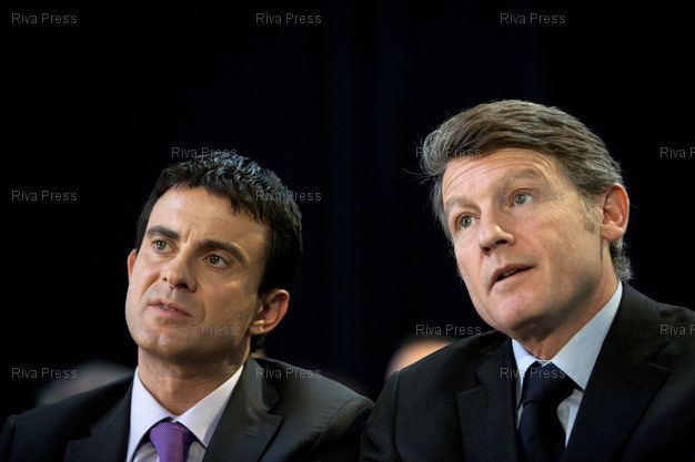 Légende : 11/12/2010 - PARIS, France - Manuel Valls et Vincent Peillon participent à la convention nationale du Parti Socialiste pour l'égalité réelle (intitulée "Egalité = réelle") à la halle Freyssinet dans le 13ème arrondissement.