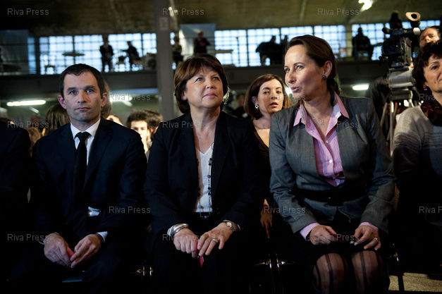 Légende : 11/12/2010 - PARIS, France - Benoit Hamon, Martine Aubry et Ségolène Royal participent à la convention nationale du Parti Socialiste pour l'égalité réelle (intitulée "Egalité = réelle") à la halle Freyssinet dans le 13ème arrondissement.