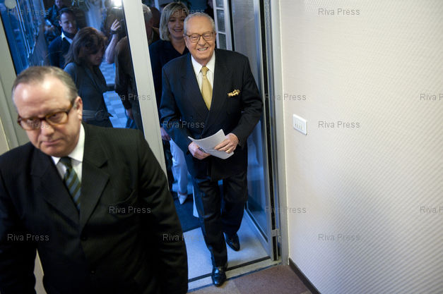 French Front National (FN) far-right party's President Jean-Marie Le Pen (C.) presents his 2011 wishes at the party's headquarters in Nanterre, near Paris. Jean-Marie Le Pen will retire as President at the party congress few days later. Her daughter Marine Le Pen and Bruno Gollnisch run for his succession.