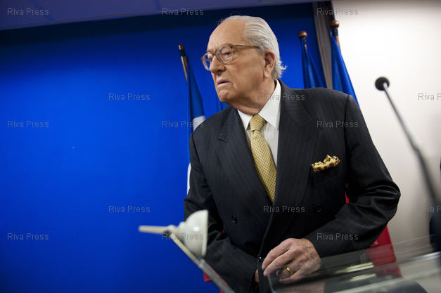 French Front National (FN) far-right party's President Jean-Marie Le Pen (C.) presents his 2011 wishes at the party's headquarters in Nanterre, near Paris. Jean-Marie Le Pen will retire as President at the party congress few days later. Her daughter Marine Le Pen and Bruno Gollnisch run for his succession.