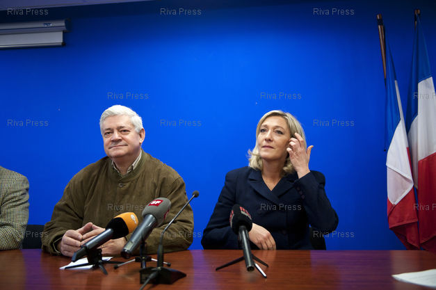 French Front National (FN) far-right party's President Jean-Marie Le Pen presents his 2011 wishes at the party's headquarters in Nanterre, near Paris. Jean-Marie Le Pen will retire as President at the party congress few days later. Her daughter Marine Le Pen (R.) and Bruno Gollnisch (L.) run for his succession.