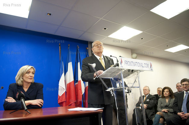 French Front National (FN) far-right party's President Jean-Marie Le Pen (R.) presents his 2011 wishes at the party's headquarters in Nanterre, near Paris. Jean-Marie Le Pen will retire as President at the party congress few days later. Her daughter Marine Le Pen (L.) and Bruno Gollnisch run for his succession.