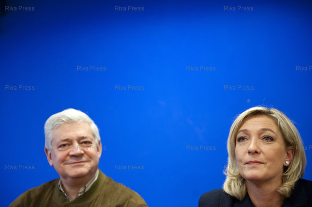 French Front National (FN) far-right party's President Jean-Marie Le Pen presents his 2011 wishes at the party's headquarters in Nanterre, near Paris. Jean-Marie Le Pen will retire as President at the party congress few days later. Her daughter Marine Le Pen (R.) and Bruno Gollnisch (L.) run for his succession.