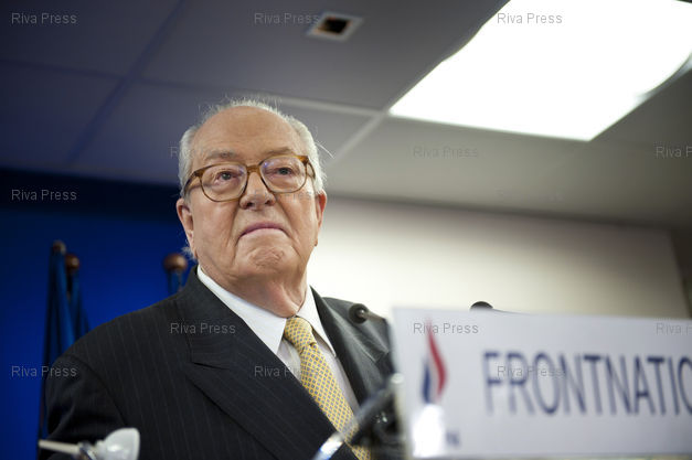 French Front National (FN) far-right party's President Jean-Marie Le Pen (C.) presents his 2011 wishes at the party's headquarters in Nanterre, near Paris. Jean-Marie Le Pen will retire as President at the party congress few days later. Her daughter Marine Le Pen and Bruno Gollnisch run for his succession.