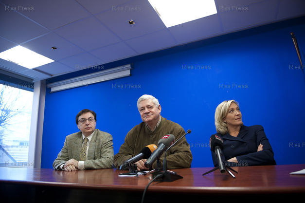 French Front National (FN) far-right party's President Jean-Marie Le Pen presents his 2011 wishes at the party's headquarters in Nanterre, near Paris. Jean-Marie Le Pen will retire as President at the party congress few days later. Her daughter Marine Le Pen (R.) and Bruno Gollnisch (C.) run for his succession.