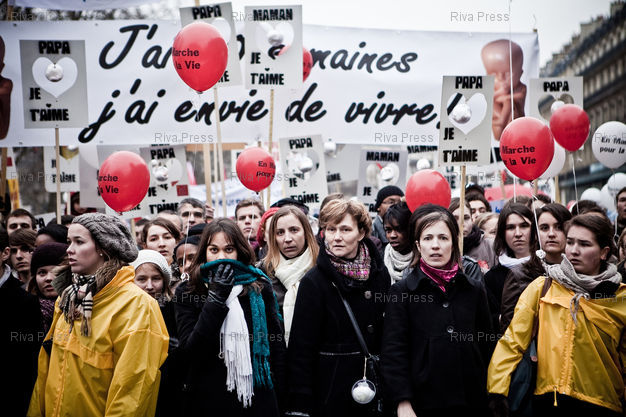 Légende : 23/01/2011 - Paris, FRANCE - Le collectif "En Marche pour la Vie" a organise une manifestation contre l'avortement et pour le developpement des aides à la maternite. PHOTO : RIJASOLO/RIVA PRESS.