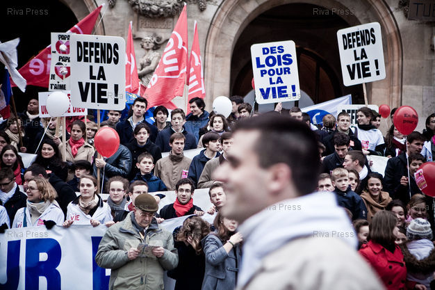 Légende : 23/01/2011 - Paris, FRANCE - Le collectif "En Marche pour la Vie" a organise une manifestation contre l'avortement et pour le developpement des aides à la maternite. PHOTO : RIJASOLO/RIVA PRESS.