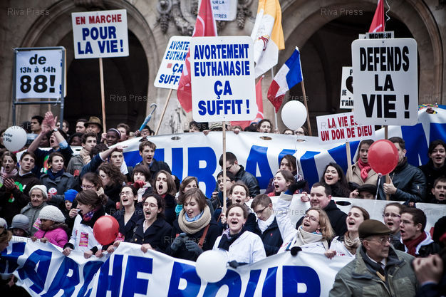 Légende : 23/01/2011 - Paris, FRANCE - Le collectif "En Marche pour la Vie" a organise une manifestation contre l'avortement et pour le developpement des aides à la maternite. PHOTO : RIJASOLO/RIVA PRESS.