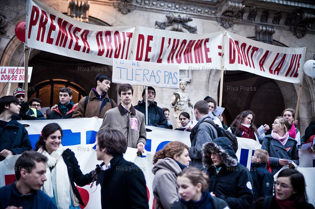Légende : 23/01/2011 - Paris, FRANCE - Le collectif "En Marche pour la Vie" a organise une manifestation contre l'avortement et pour le developpement des aides à la maternite. PHOTO : RIJASOLO/RIVA PRESS.